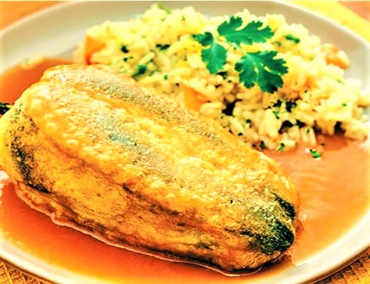 Chile verde capeado y relleno de queso, bañado con caldillo de jitomate.