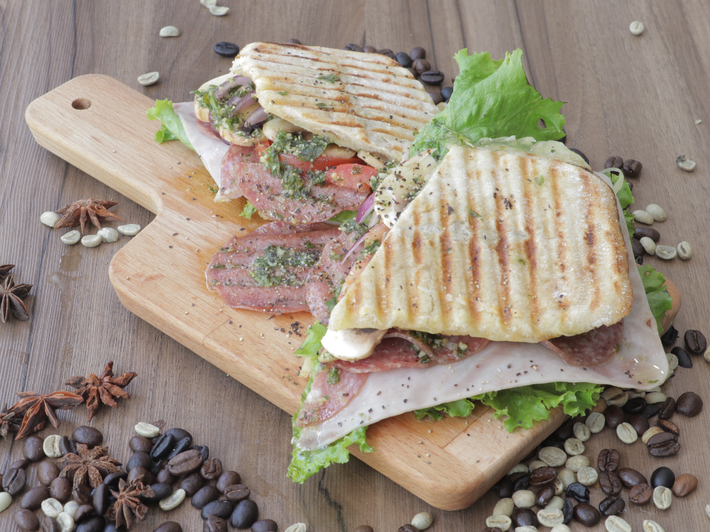 Panini con jamón de pierna, queso provolone, salami, mix de lechugas, jitomate, champiñones, cebolla y aderezo italiano.