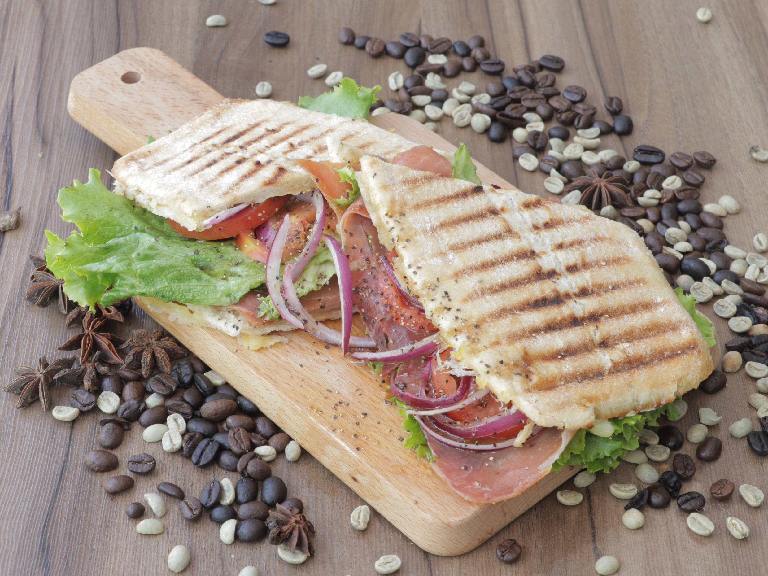 Panini con jamón serrano, queso cheddar, mix de lechugas, jitomate, cebolla con vinagreta balsámica.
