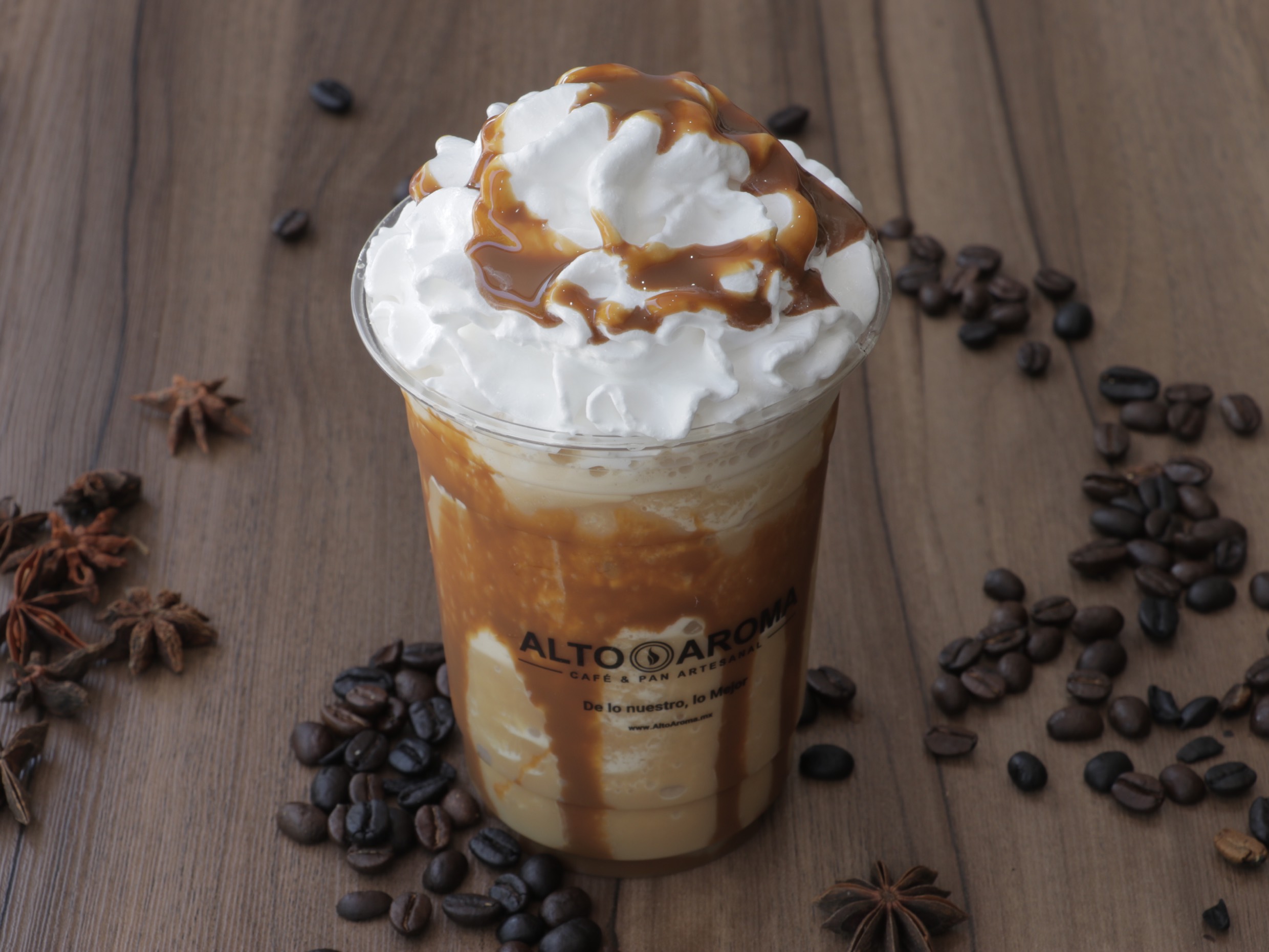 Espresso, leche, cajeta y crema batida.