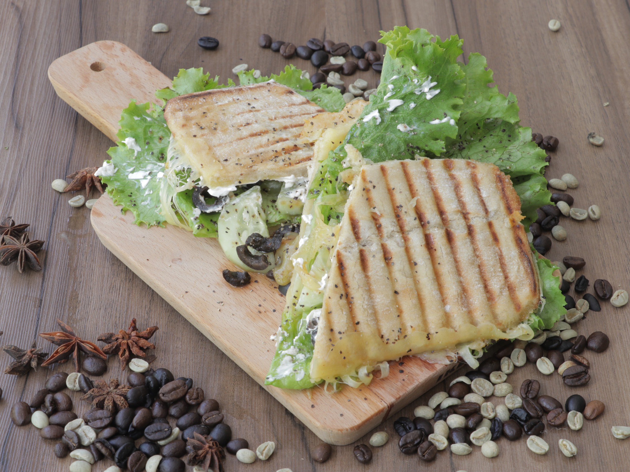 Panini con queso cheddar, queso provolone, queso de cabra, mix de lechugas, pepino, aceitunas y aceite de oliva.