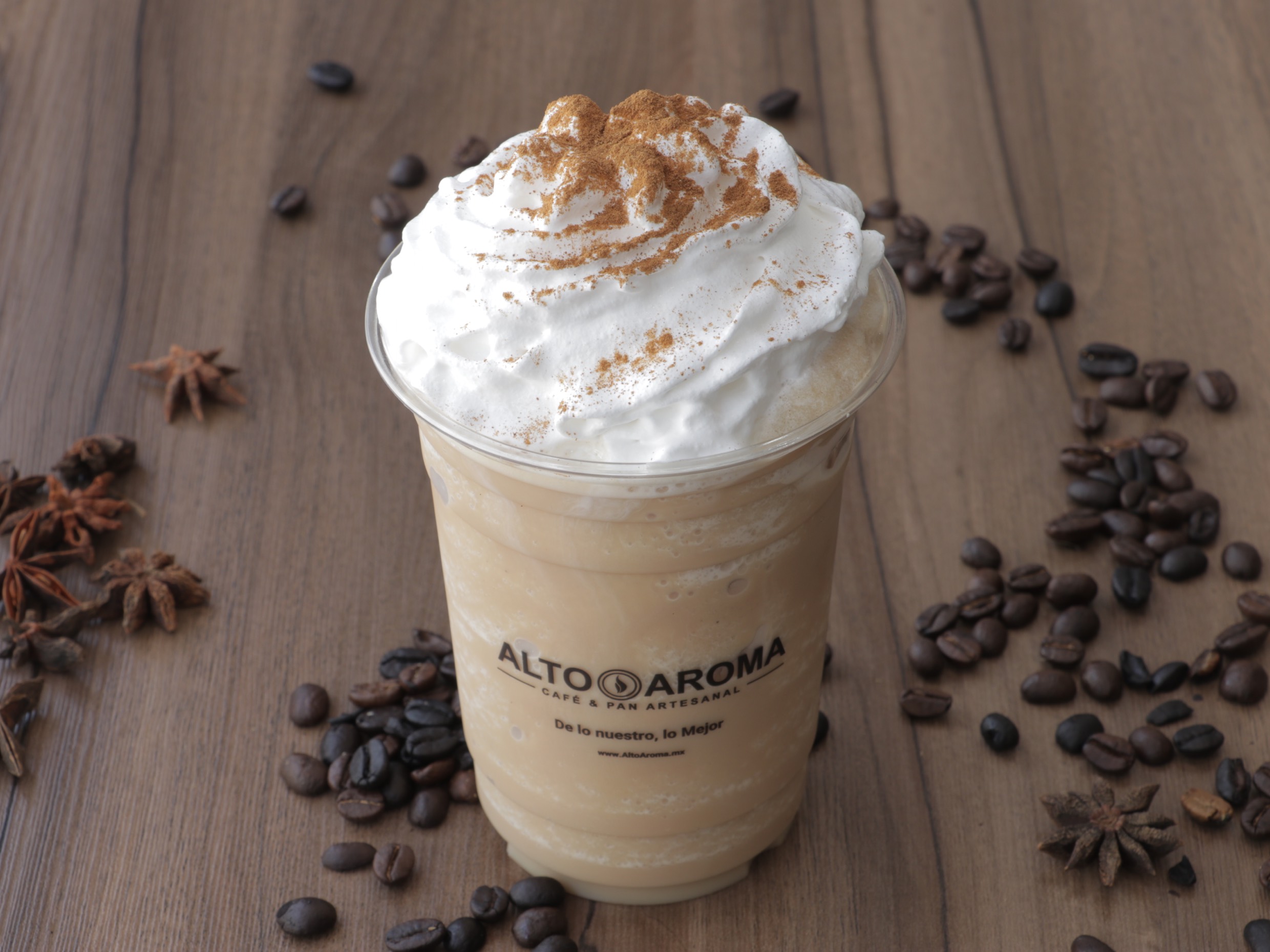 Espresso, vainilla, leche fría espumada y canela en polvo.