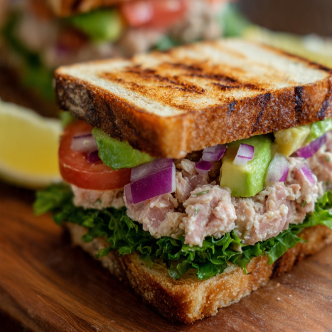 Sándwich (Pan Grande) con lechuga, jitomate, cebolla morada, atún, mayonesa al chipotle y aguacate.