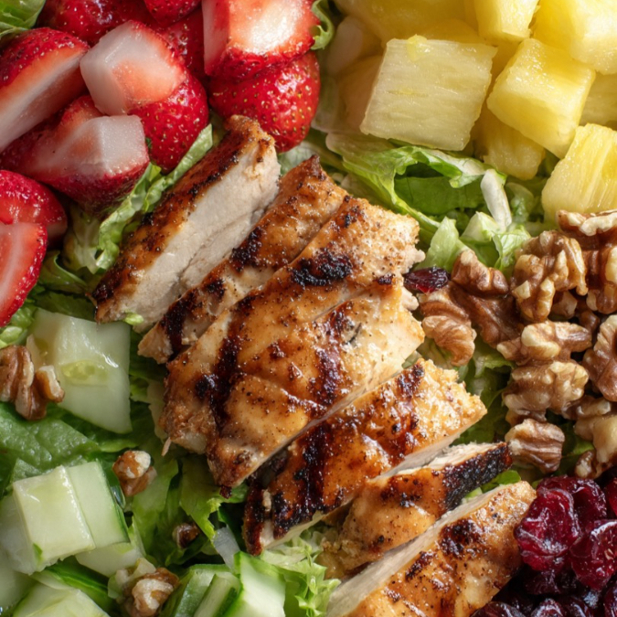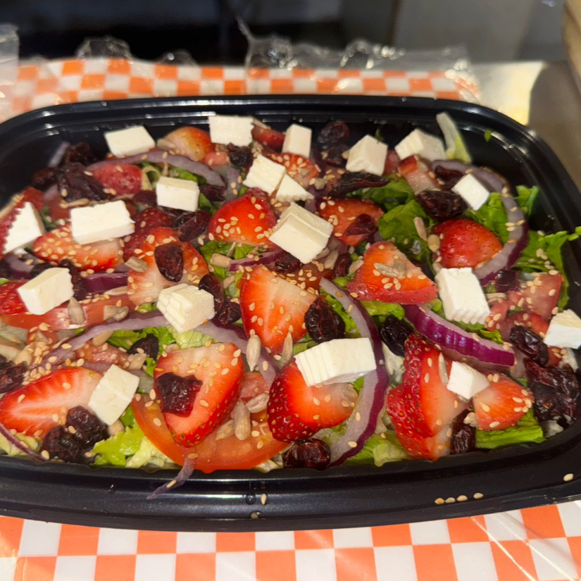 Mix de lechugas frescas, jitomate, cebolla morada, espinaca, fresa, queso panela, arándano y proteína a elegir.