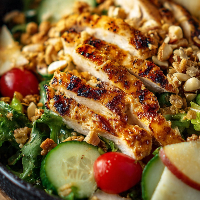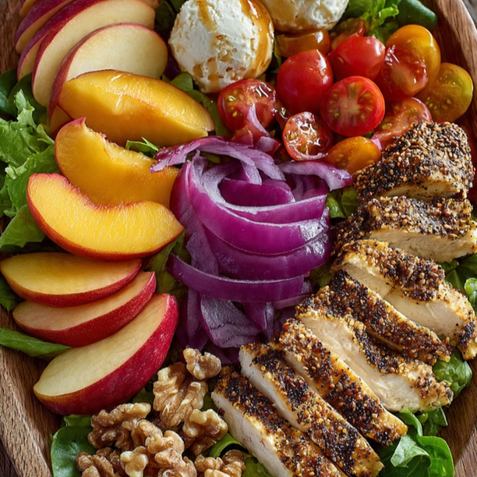 Mix de lechugas Frescas, jitomate, cebolla morada, Durazno, manzana, queso crema, nuez y ajonjolí en la proteína a elegir