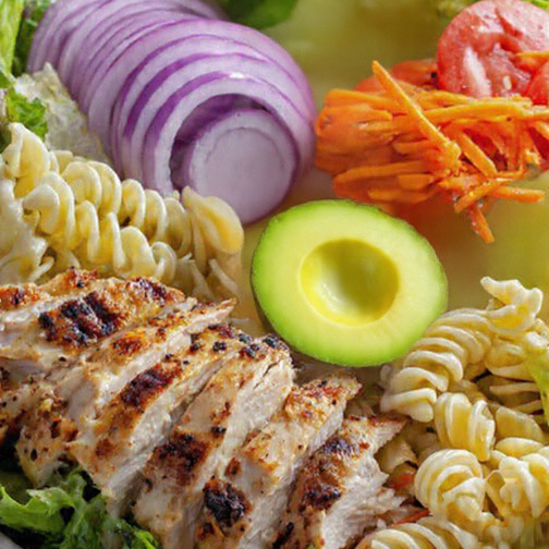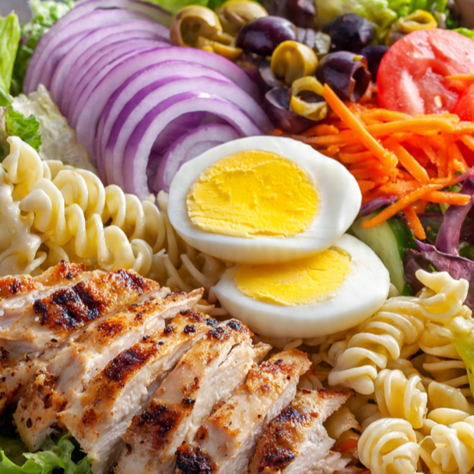 Mix de lechugas frescas, jitomate, cebolla morada, huevo cocido, zanahoria rayada, Apio, Fusilli, aceitunas y proteína a elegir