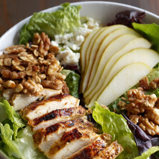 Mix de lechugas Frescas, jitomate, cebolla morada con rodajas de Pera y manzana, nuez y proteína a Elegir