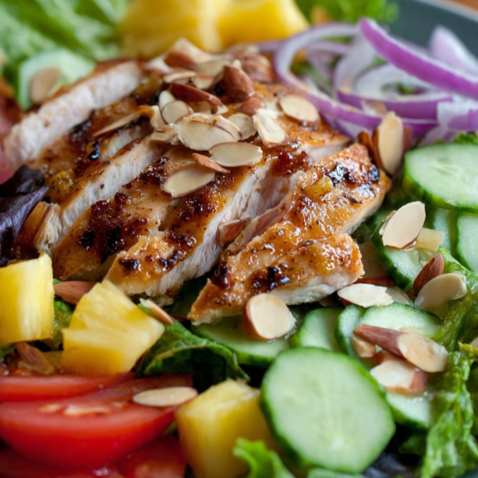 Mix de lechugas Frescas, jitomate, cebolla morada, pepino, piña y almendra, proteína a elegir