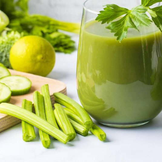 Jugo Verde, Fresco a base de Agua o jugo de Naranja, con Apio, Espinaca, Perejil, Manzana, Piña, Jengibre, Avena, Linaza y Chía