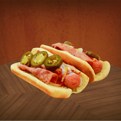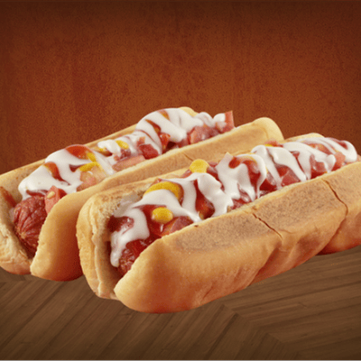 2 Pz de hot dogs con tocino, preparados con salchicha jitomate, cebolla y chile jalapeño..