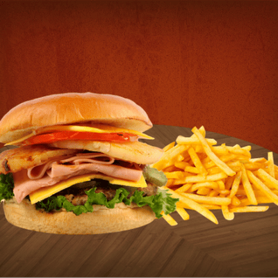 150 gr de jugosa carne, jamón, queso cheddar doble piña, jamón, lechuga italiana, jitomate, cebolla, pepinillos y papas fritas 150 gr.