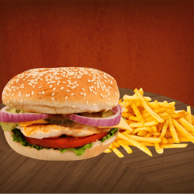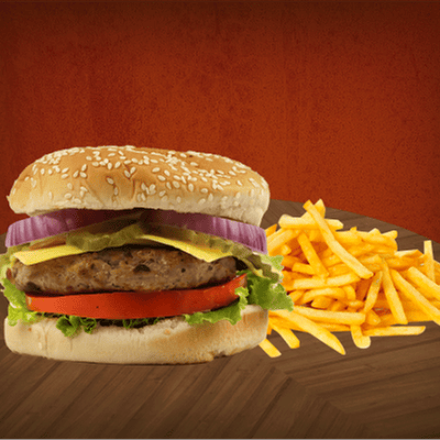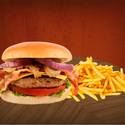 150 gr de jugosa carne, queso cheddar, lechuga italiana, jitomate, cebolla, pepinillo y papas fritas 150 gr.