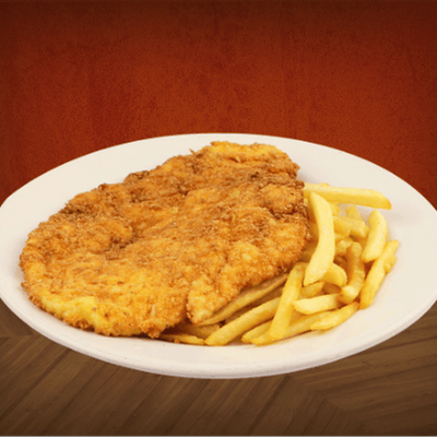 250 gr de milanesa de pollo empanizada acompañada de papas a la francesa.