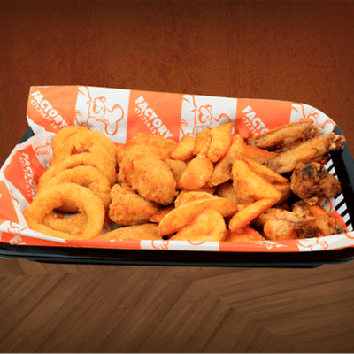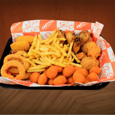 Disfruta de 4 alitas, 4 boneless, 4 nuggets, 12 palomitas de pollo, bañados en tu salsa favorita. con 200 g de papas fritas y 4 aros de cebolla.