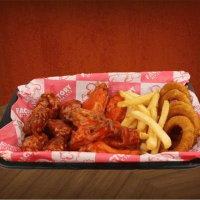 10 pz de alitas, 10 pz de boneless, bañados en tu salsa preferia, con 200 gr de papas a la francesa o crisscut y 6 aros de cebolla.