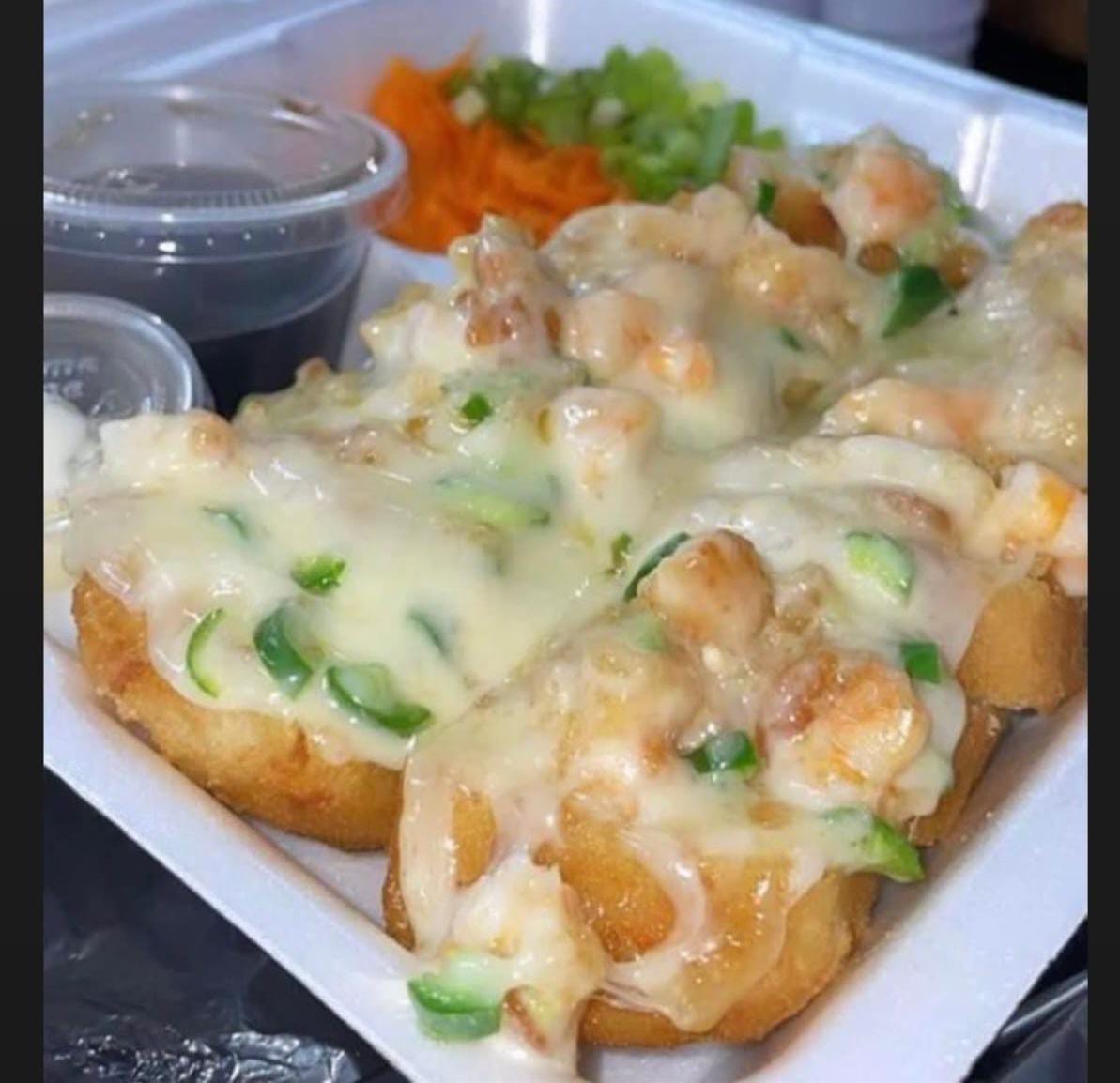 relleno de queso philadelphia, camarones empanizados cubierto por platano macho dorado