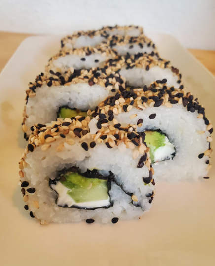 Relleno de pepino, aguacate, queso philadelphia Por fuera espolvoreado de ajonjolí