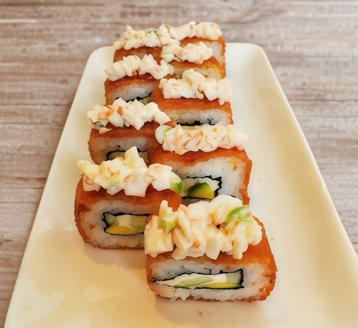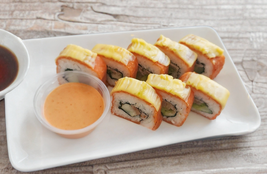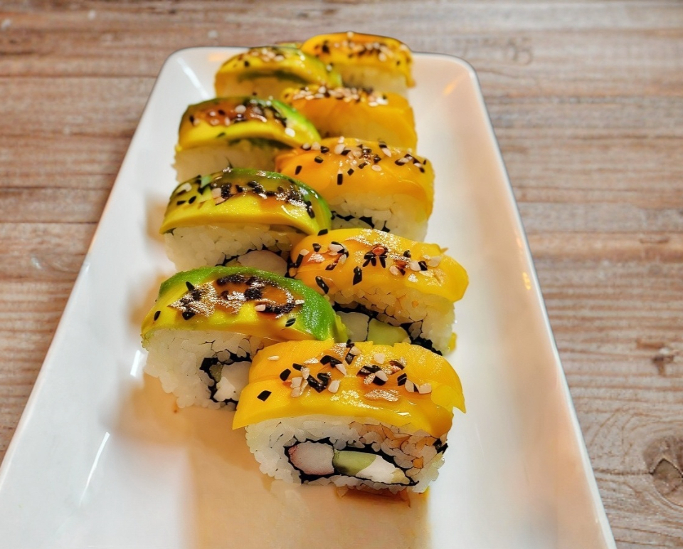 Arroz de sushi, zanahoria, pepino, aguacate, mango, camarones empanizados, espolvoreado de ajonjoli mas un dip de mango habanero.