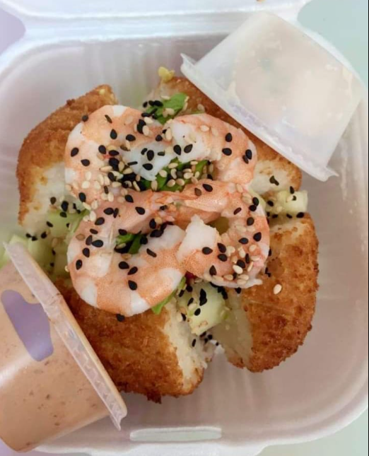 Deliciosa bola de arroz empanizada con camarón como proteína, rellena de queso philadelphia aguacate y pepino.
