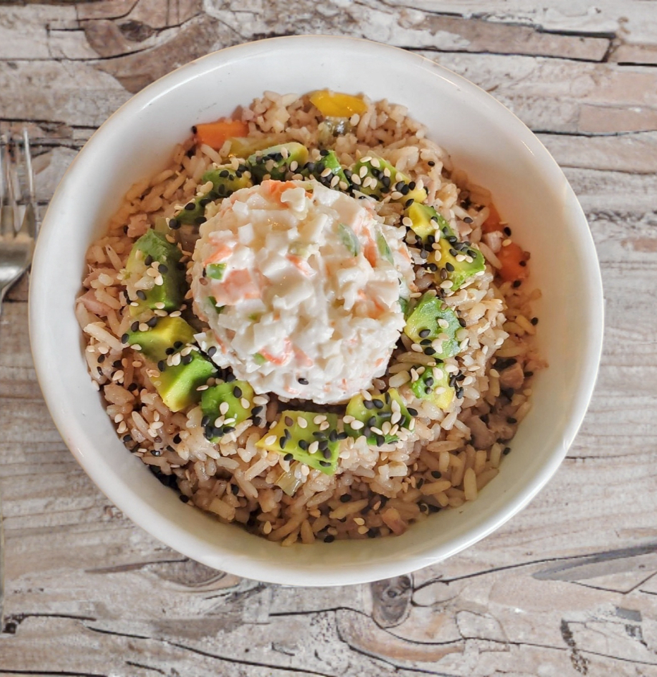 Rico arroz frito con verduras sazonadas, aguacate y ajonjolí.