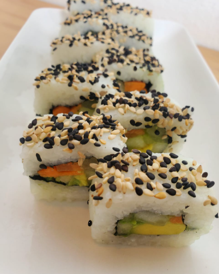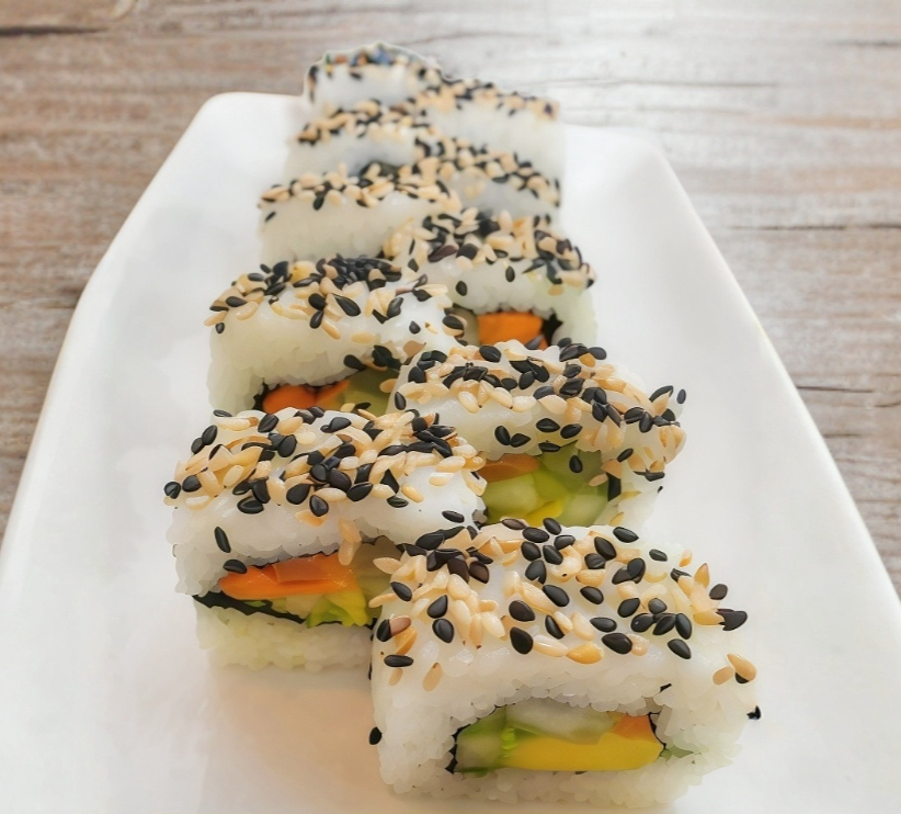 relleno de pepino,zanahoria, aguacate, por fuera espolvopreado de ajonjoli