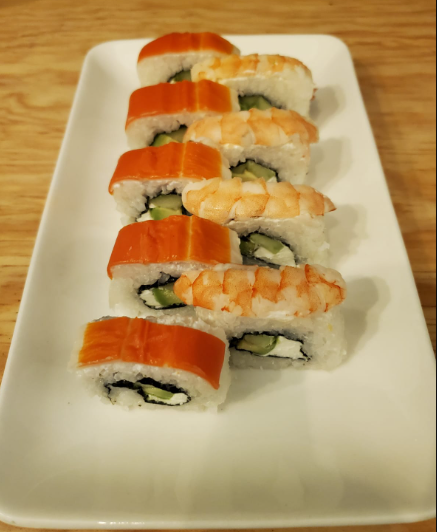 200grms de arroz, rellena de pepino,aguacte,camarones, por fuera una capa de queso philadelphia y espolvoreada de ajonjoli