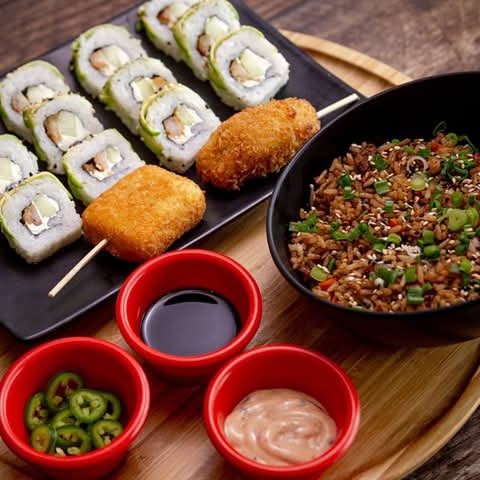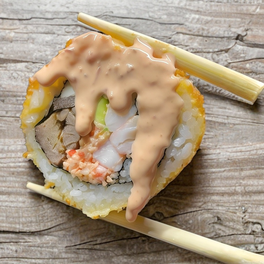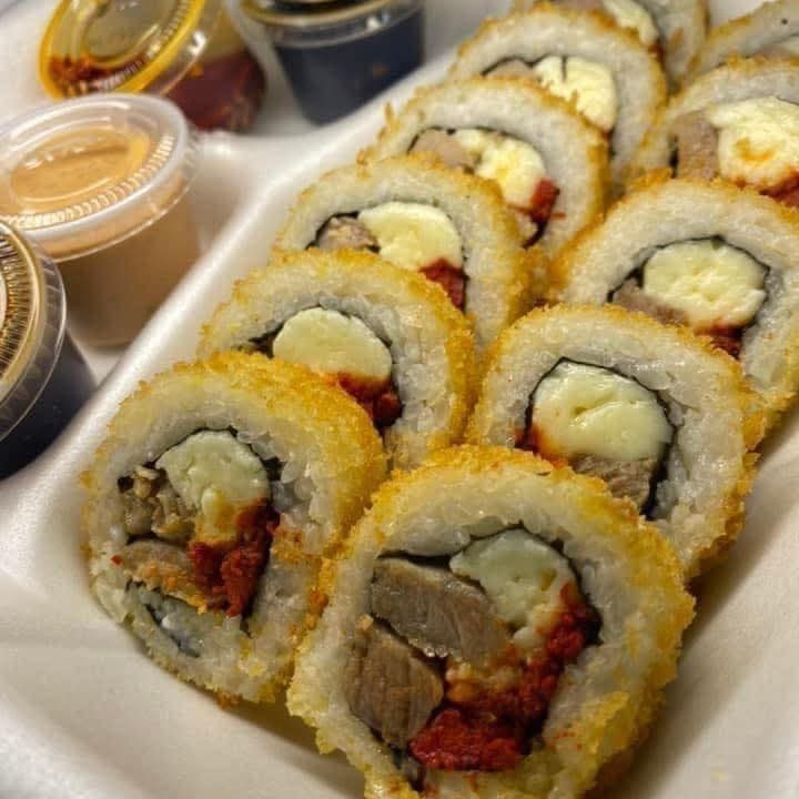 Arroz de sushi, pepino, aguacate, mango, zanahoria mas barras de surimi empanizadas mas dip de chipotle.
