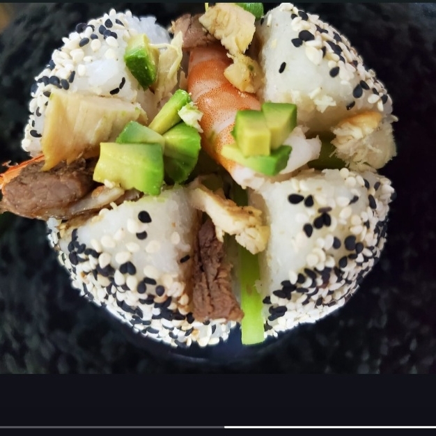 Arroz de sushi, mango, pepino, zanahoria, aguacate, pechuga de pollo empanizada con una salsa a la bbq espolvoreada de ajonjoli.