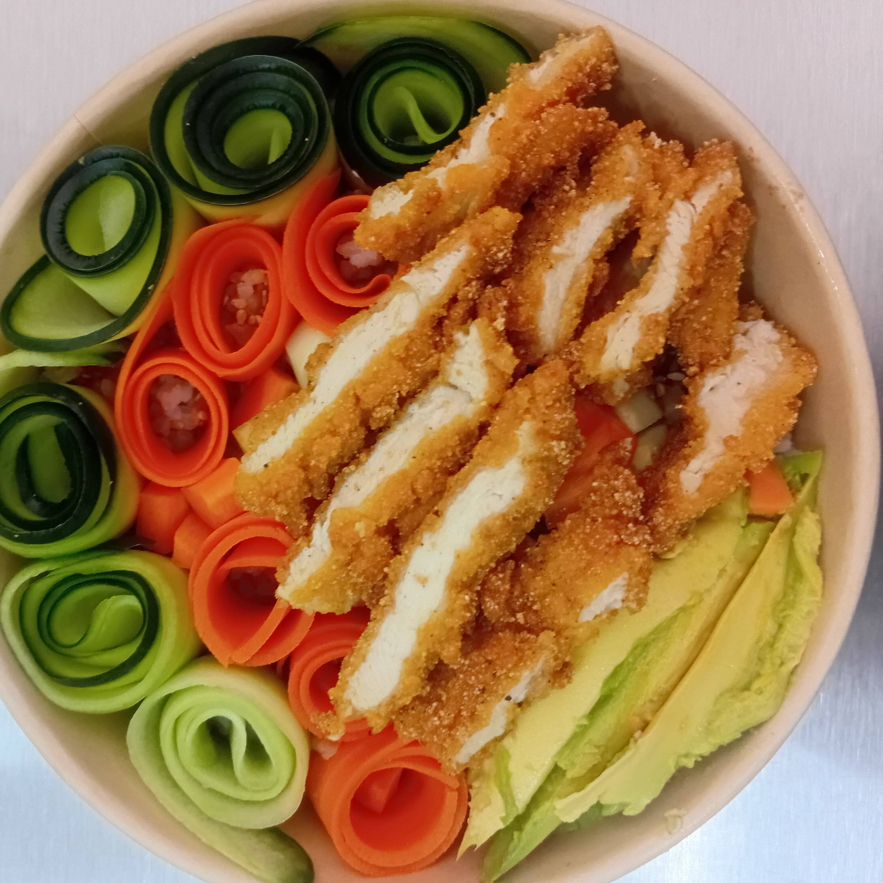 Rico arroz frito con verduras sazonadas, aguacate, ajonjolí con pechuga de pollo como proteína.