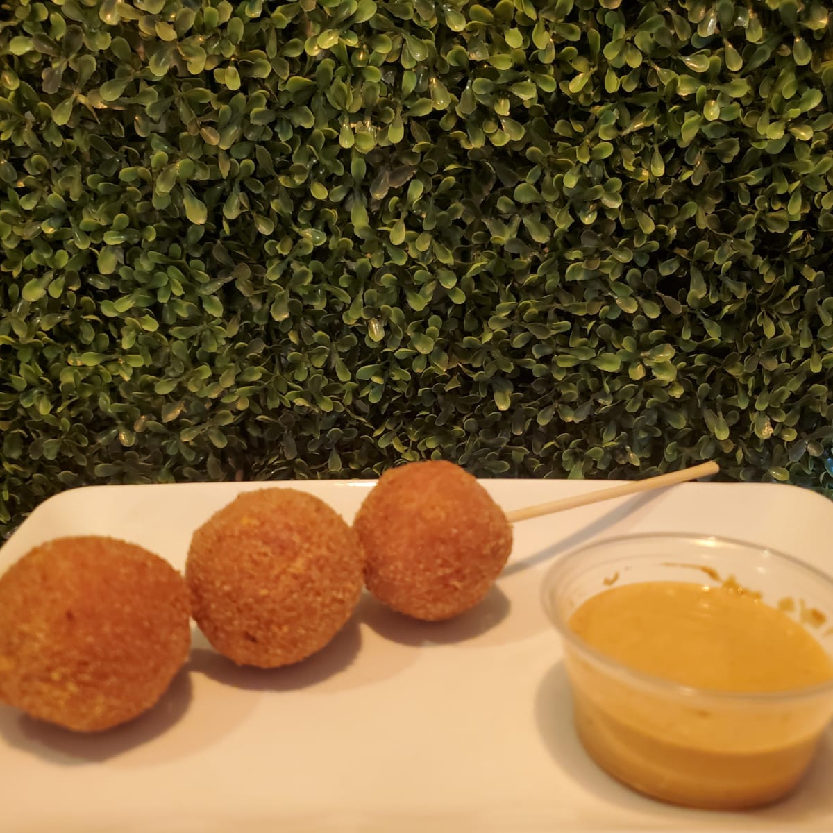 Banderilla de queso philadelphia y res marinado, empanizada y acompañada con dip de chipotle.
