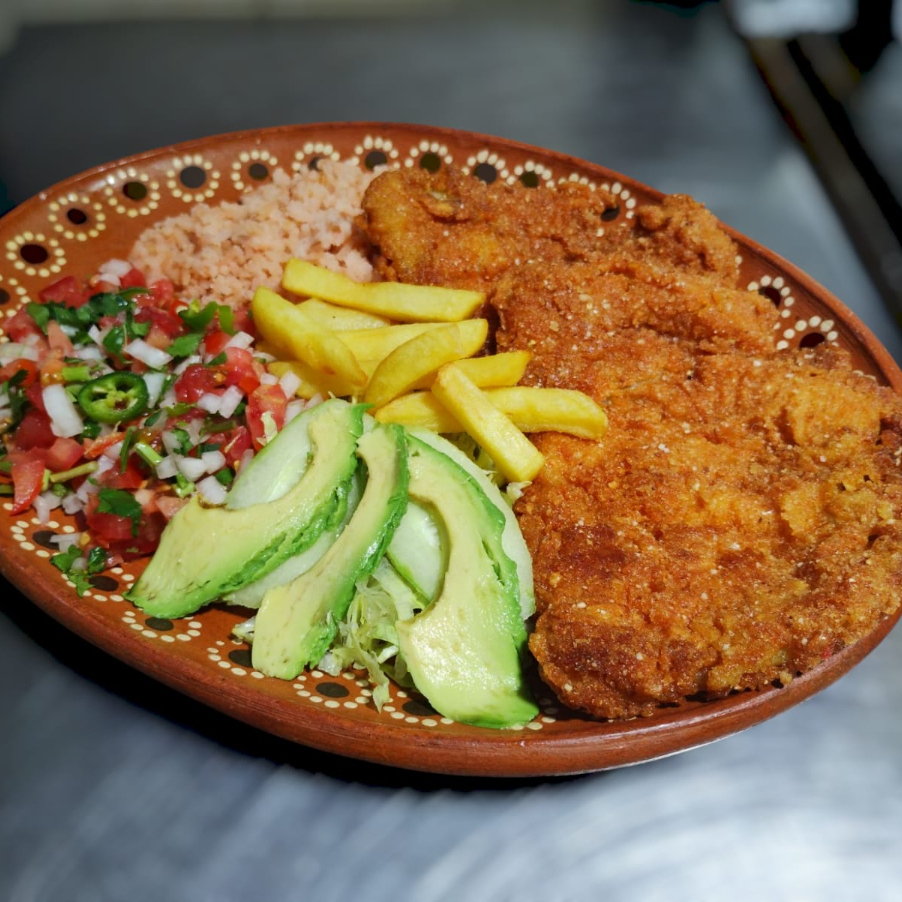 Milanesa de pollo acompañada con papas a la francesa, sopa de arroz, frijoles, ensalada, tortillas y salsa aparte.
