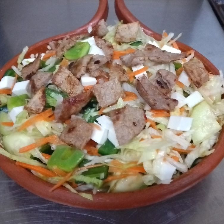 Lechuga, jitomate, pepino, nopal, zanahoria, queso blanco y aderezo césar.