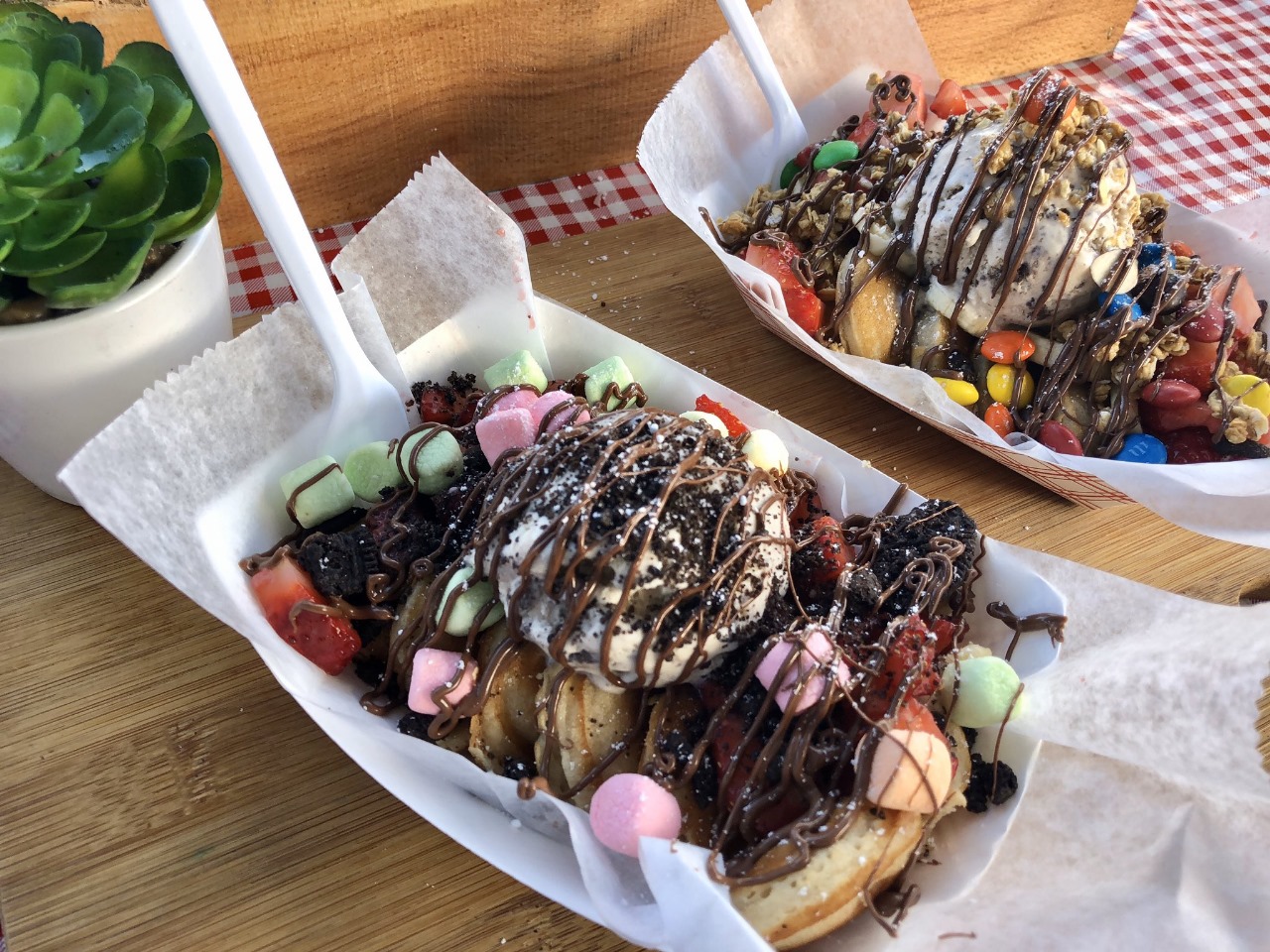 Chantilly, chispas de chocolate, chocolate liquido, popote de galleta, bombones, chamoy en polvo, chamoy en liquido, gomitas de chile y popote de tamarindo.
