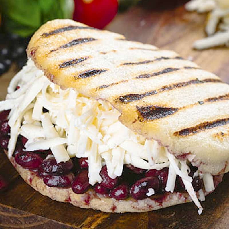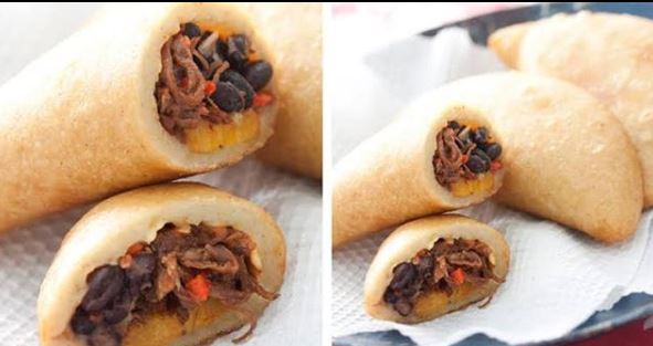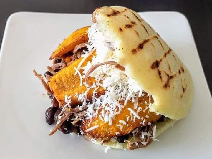 Frijoles negros, carne deshebrada, queso cotija y plátano