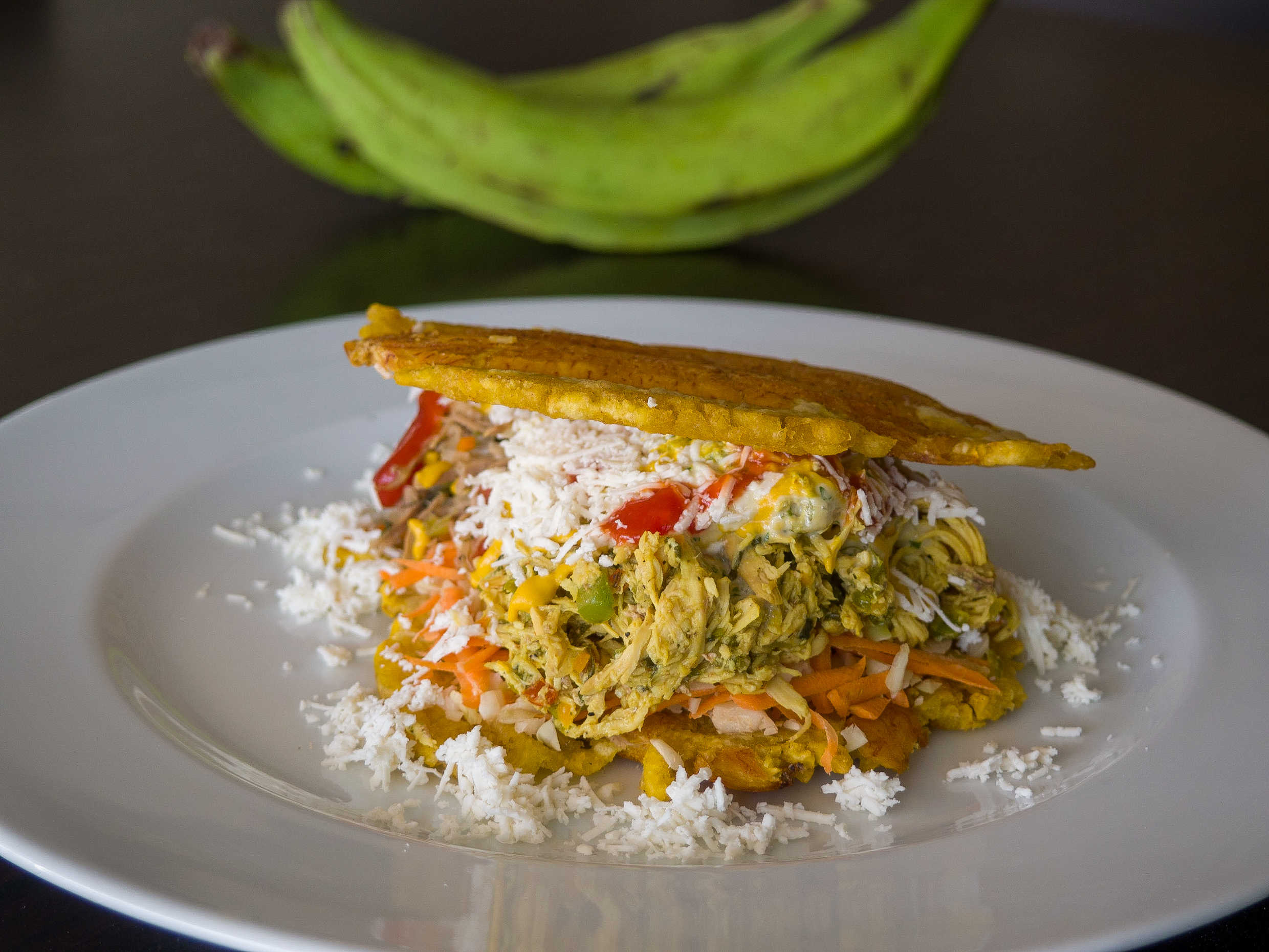Tostadas de plátano verde, lechuga, tomate, cebolla, pollo, queso y salsas