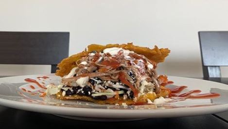 Tostadas de plátano verde,lechuga, tomate, cebolla, carne, queso y salsas