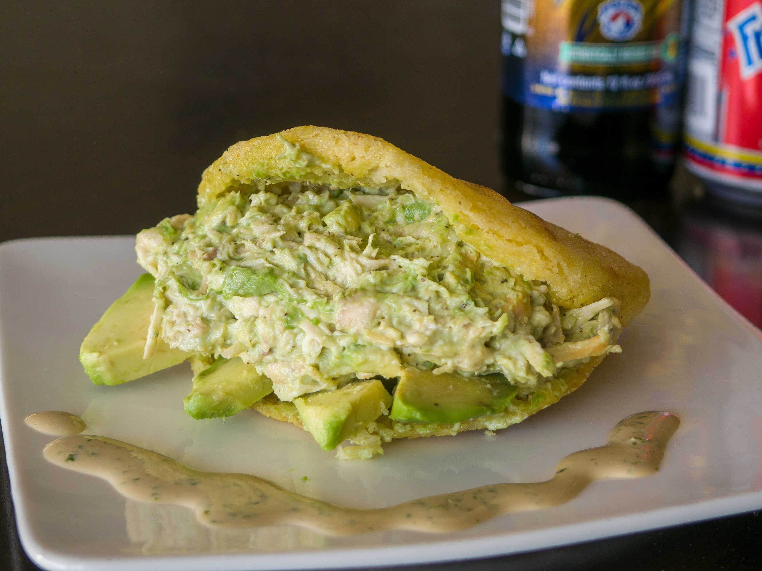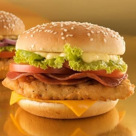 Pollo aplanado, pepinillo, tocino, salsas, queso.