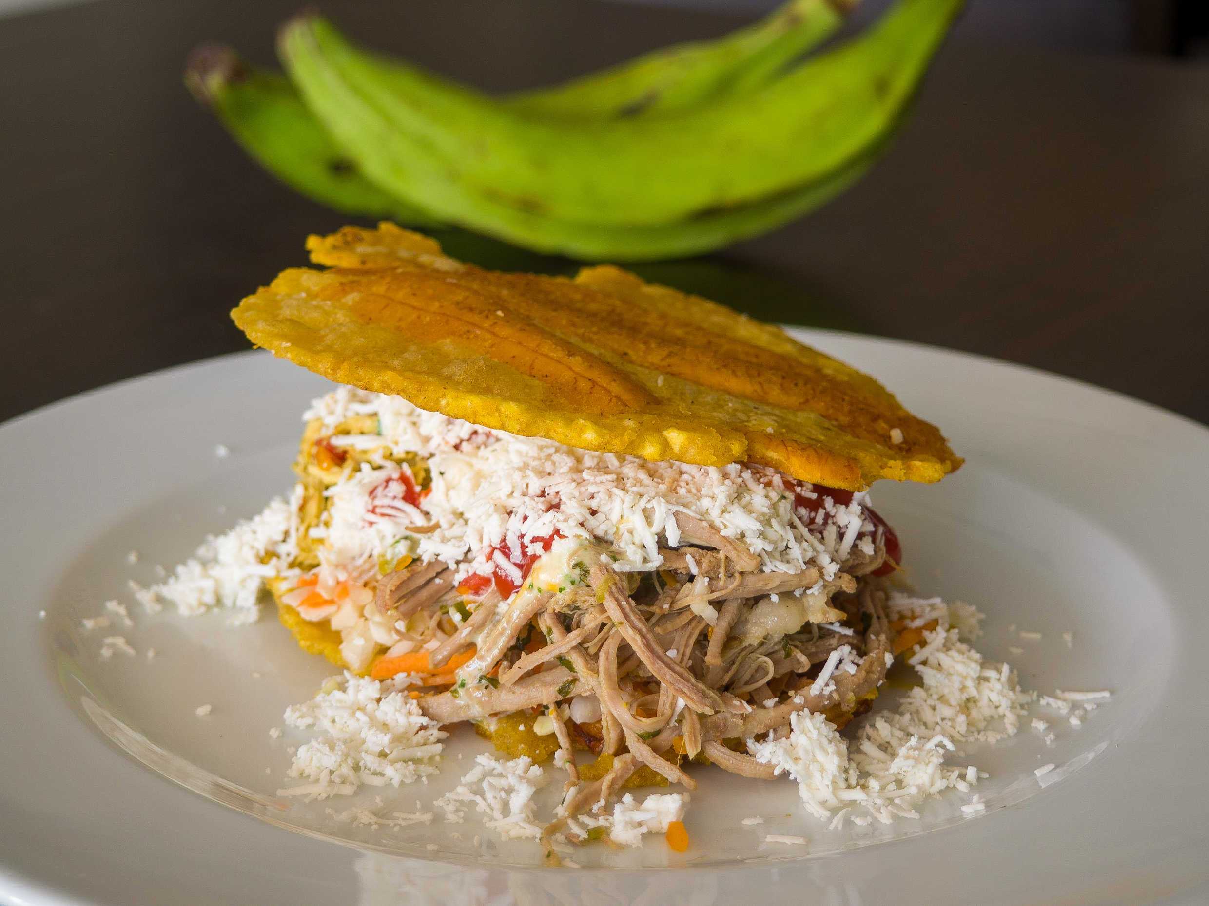 Tostadas de plátano verde,lechuga, tomate, cebolla, pollo y carne, queso y salsas
