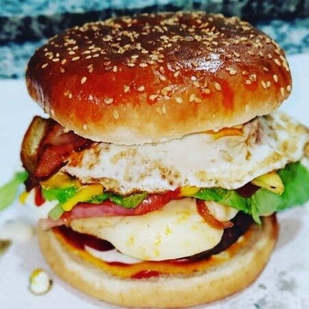 Doble carne, tocino, lechuga, tomate cebolla, salsas.