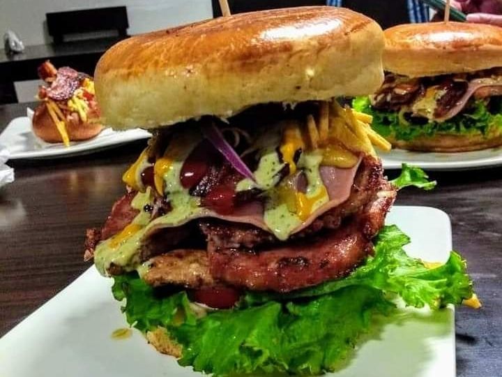 Carne, lechuga, tomate, cebolla grille, ripio de papa, tocino, queso salsas.