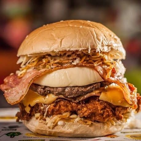 Carne, pollo aplanado, lechuga, tomate, cebolla, ripio de papa, queso, tocino, salsas.