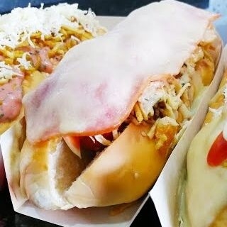 Salchicha jumbo, ripio de papa, queso, jamón, salsas.