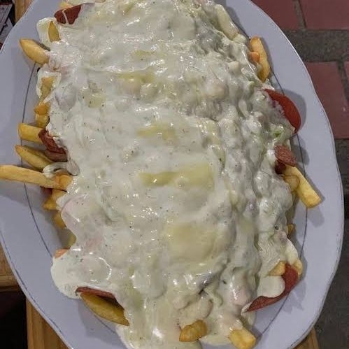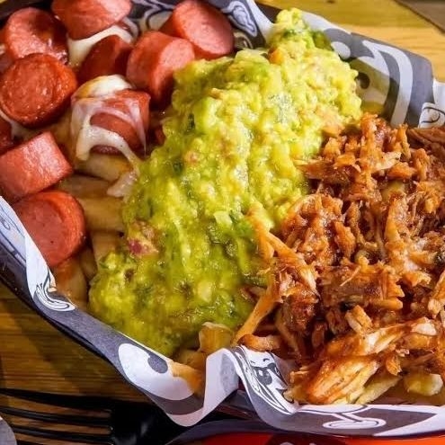 Papas francesas, salchicha, chorizo, guacamole, pulled por, queso gratinado.