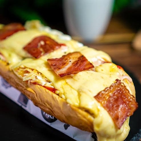 Salchicha jumbo, cebolla grille, ripio de papas, queso gratinado, tocino.