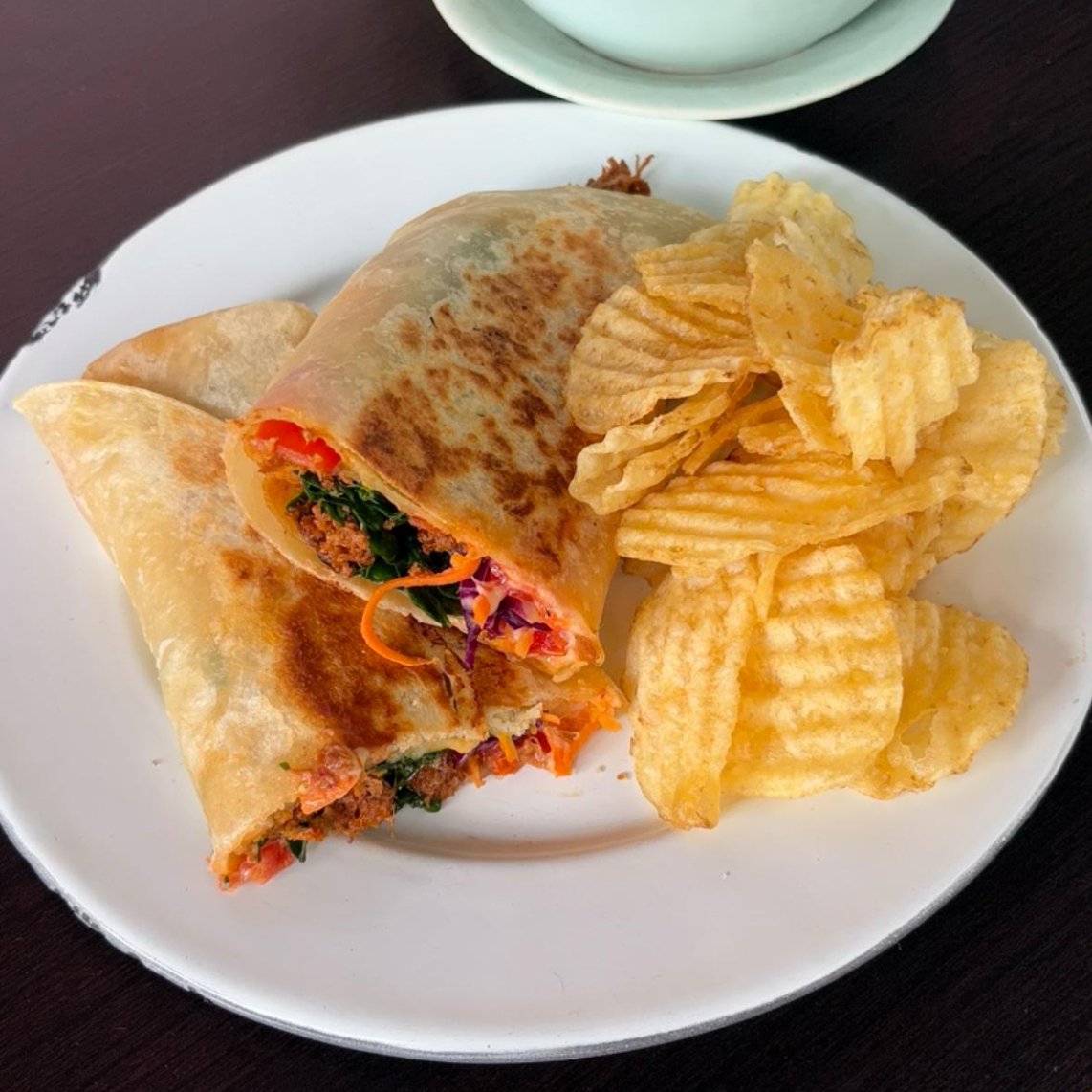 Con espinaca, jitomate, cebolla morada y queso Gouda, delicioso wrap con la receta de la casa.