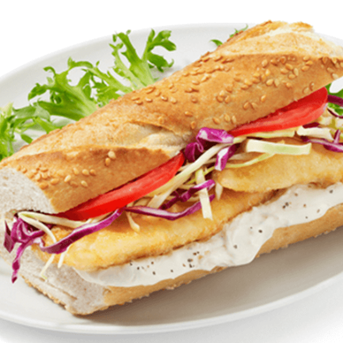 Baguette 15 cm con pescado, ensalada de la casa.