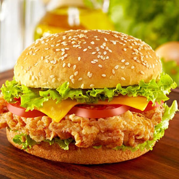 Pollo empanizado, queso amarillo, pan jumbo, verduras y aderezos.