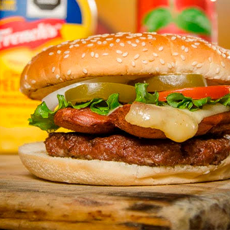 Hamburguesa con lechuga, carne, salchicha, tocino, pan jumbo, queso asadero, queso amarillo, verduras y aderezos.