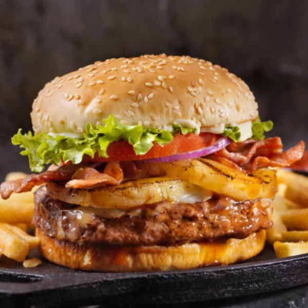 Hamburguesa con lechuga, carne, piña, jamón, tocino, pan jumbo, queso asadero, queso amarillo, verduras y aderezos.