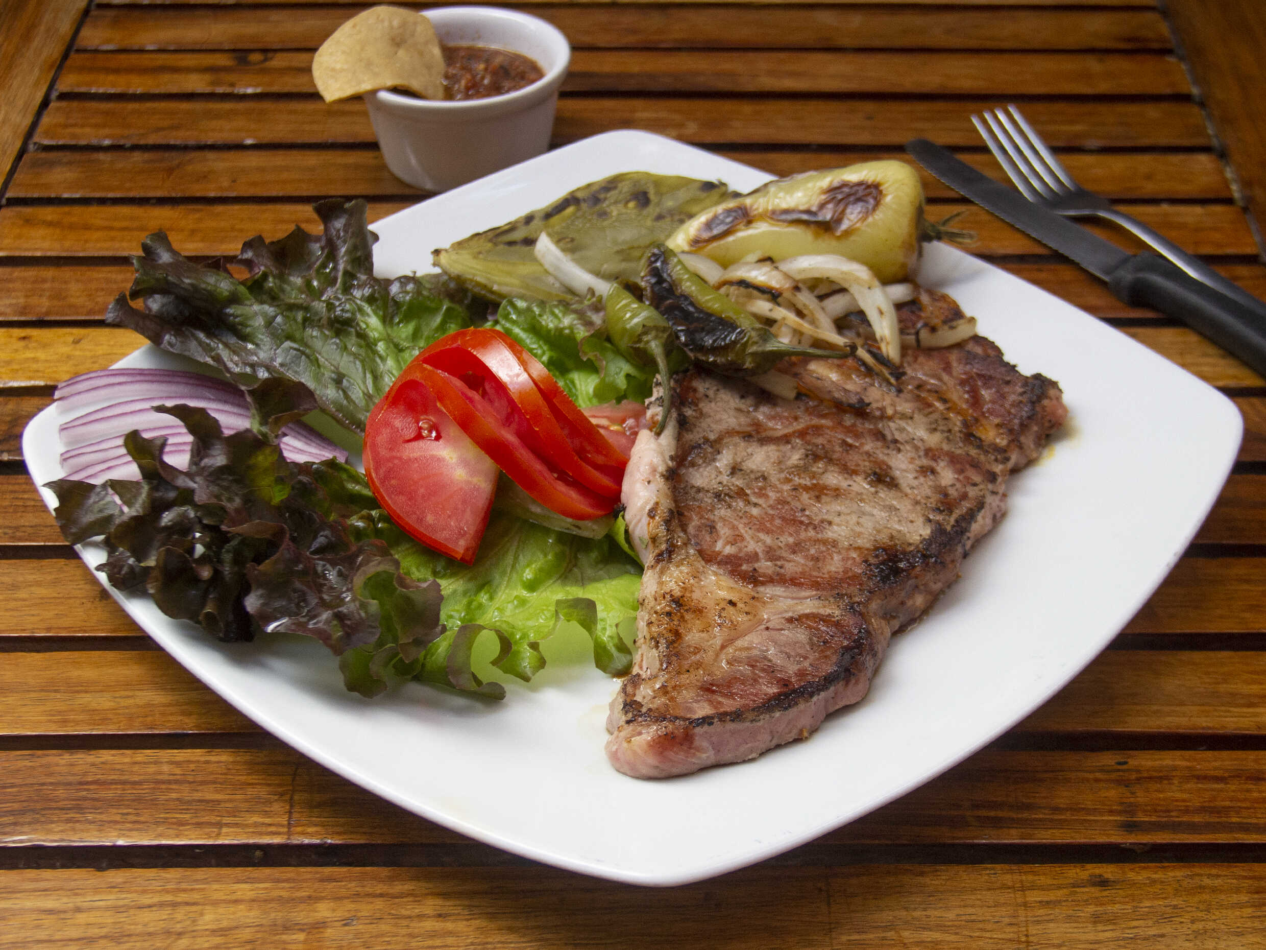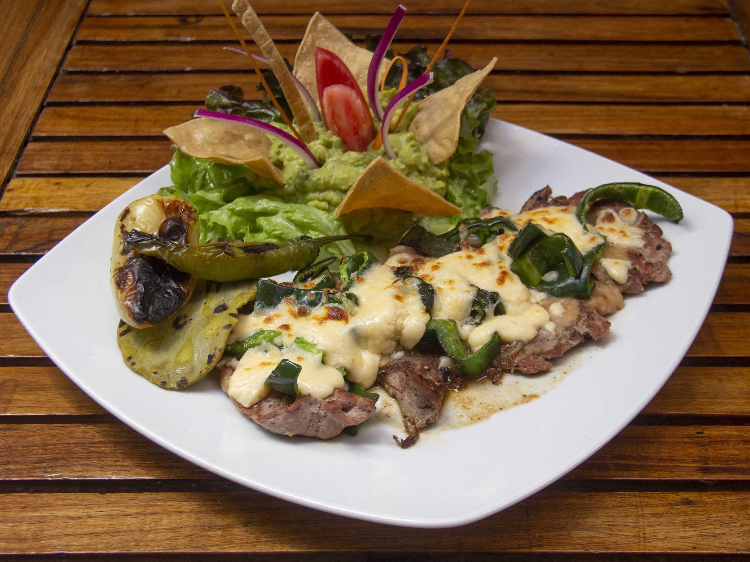 250gr. Carne de res a la plancha con una rica guarnición mexicana, guacamole, frijoles, 1 enchilada roja y 1 quesadilla.
